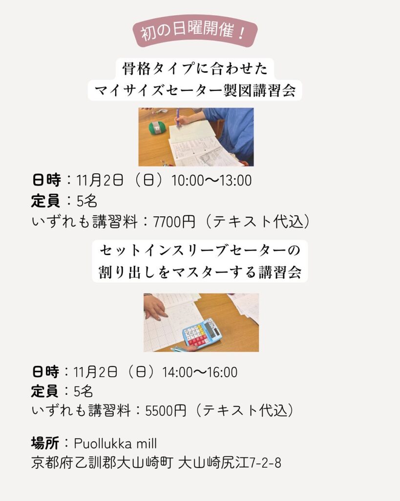 atricot 笹谷さんの製図講習会、11月にもPuolukka Mill での開催が決定しました📢