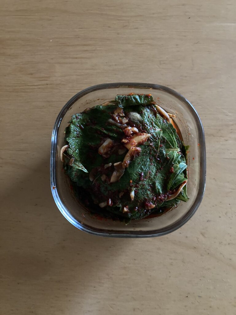 今回はエゴマの葉のキムチを作るとのこと。材料はニンニク(たくさん潰しました)、玉ねぎとエゴマの葉。とてもシンプルな材料です。玉ねぎとニンニク、唐辛子といかなごエキス、醤油、そして主催者さん自家製の梅シロップを混ぜて、それをエゴマの葉に塗っては重ね、塗っては重ね、していきます。なんやかんや話をしながら、塗り塗りと。楽しい!他の野菜でも作ってみたい。
