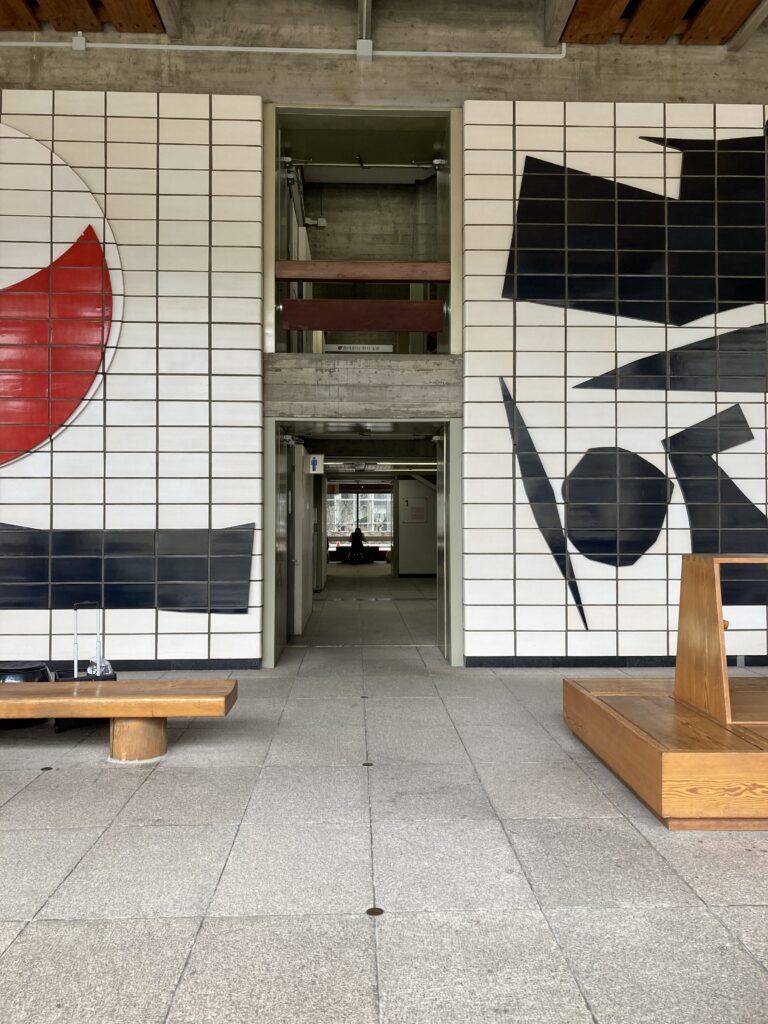 中を見てもいいのかな、と中に入ってみると、一階は完全に建物の説明フロアとなっていて、模型や設計図などの展示もあります。丹下健三氏によるこの建物は、「文化遺産としてのモダニズム建築20選」に選ばれているそうで、その20選の中には大山崎にある聴竹居が入っていて、わあ!聴竹居!と声が出ました。中には猪熊弦一郎氏による陶版壁画が。猪熊さんの美術館は3年前に訪れたので、つながるなあと。