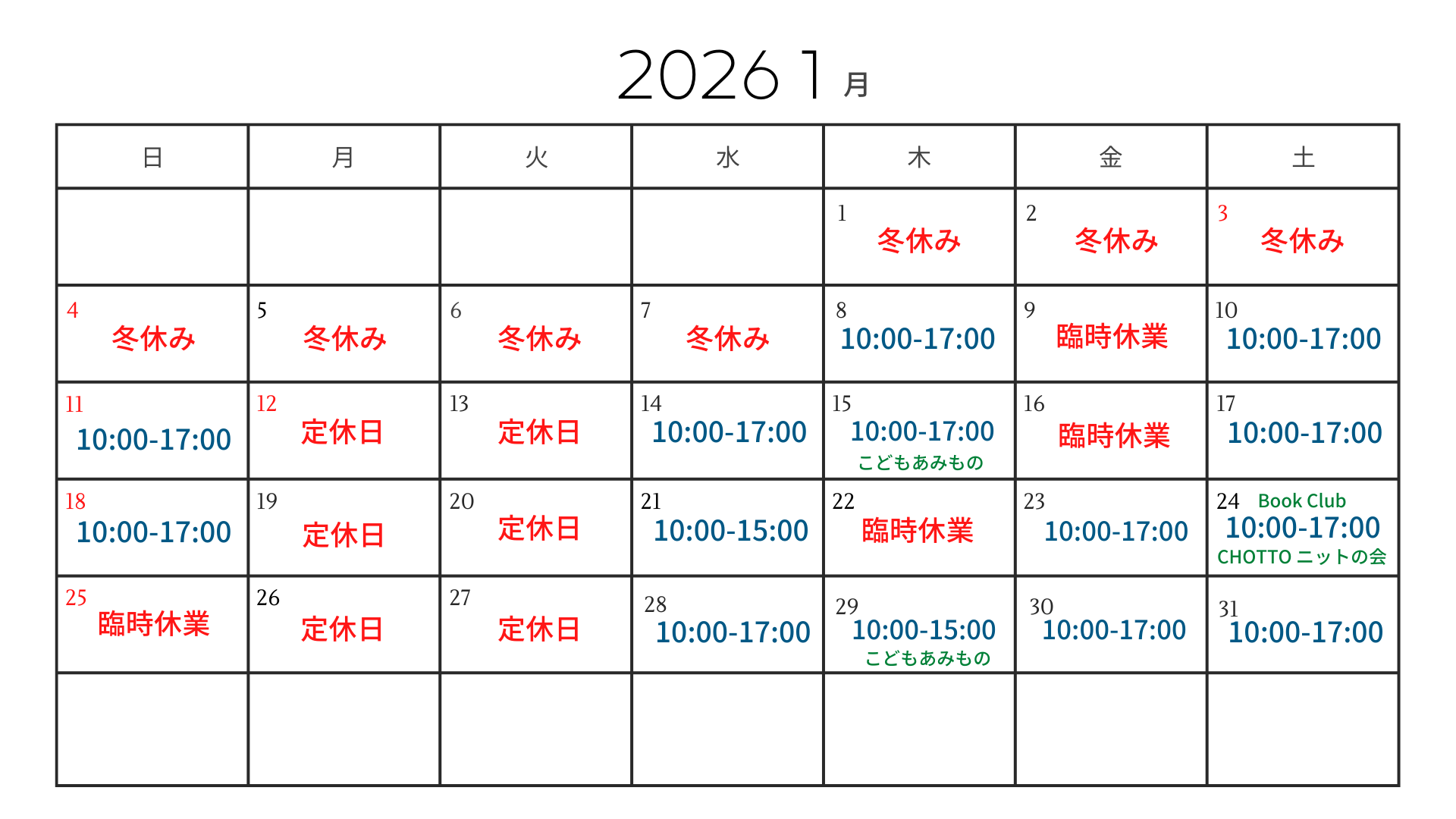 2026年1月の営業日時のお知らせです。
