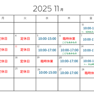 2025年11月の営業日時のお知らせ 2025年10月31日2025年10月31日 puolukka 11月の営業日時のお知らせです。 涼しいですね。読書の秋、編み物の秋到来です。 今月もよろしくお願いします。 🚩月曜日・火曜日 定休日です。 🚩11月6日(木)・9日(日)・19日(水)・ […]