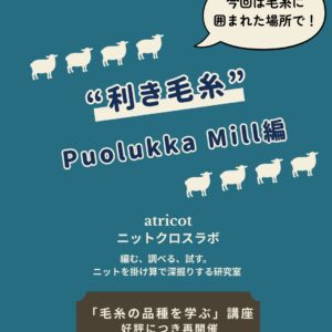 【利き毛糸、もう一度。Puolukka編】&【作り目100本ノック 第一弾】2026年3月13日(金)に開催 2026年3月7日2026年3月7日 puolukka atricotさん企画 前回気になっていたけれど来られなかった方へ。 2026年3月13日(金)ニットクロスラボ【利き毛糸、もう一度。Puolukka編】をPuolukka Millで開催します。 同じウールでも、 模様 […]