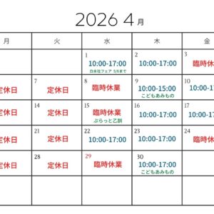 2026年4月の営業日のお知らせ 2026年3月31日2026年3月31日 puolukka 2026年4月の営業日時のお知らせです。 春の訪れ、新しい気持ちで過ごしたいと思います。 どうぞよろしくお願い致します。 🚩月曜日・火曜日 定休日です。 🚩4月3日(金)・5日(日)・8日 […]
