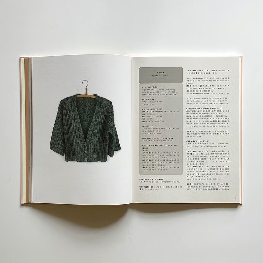 パターンも原著と同じく文章パターンですが、英文パターン翻訳の第一人者である西村知子さんに翻訳をお願いし、さらに風糸ブックスでテクニカル編集を加え、なるべく日本のニッターさんに理解していただきやすくなるよう調整しています(そのためイサガー社が個別に販売しているパターンとは一部表現が異なる場合があります)。