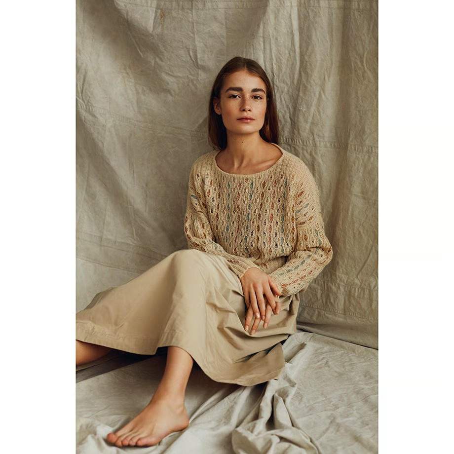 オリジナルはイサガー社から2019年に刊行されたこちらの本。ヘルガさんがニットでも刺繡でも“1目”は“Stitch”であることからインスピレーションを得て、ニットと刺繡の融合をテーマに作品をデザインされた一冊です。カーディガン2点、セーター5点、ワンピース1点、帽子1点、ストール1点の合計10点が収録されています。
