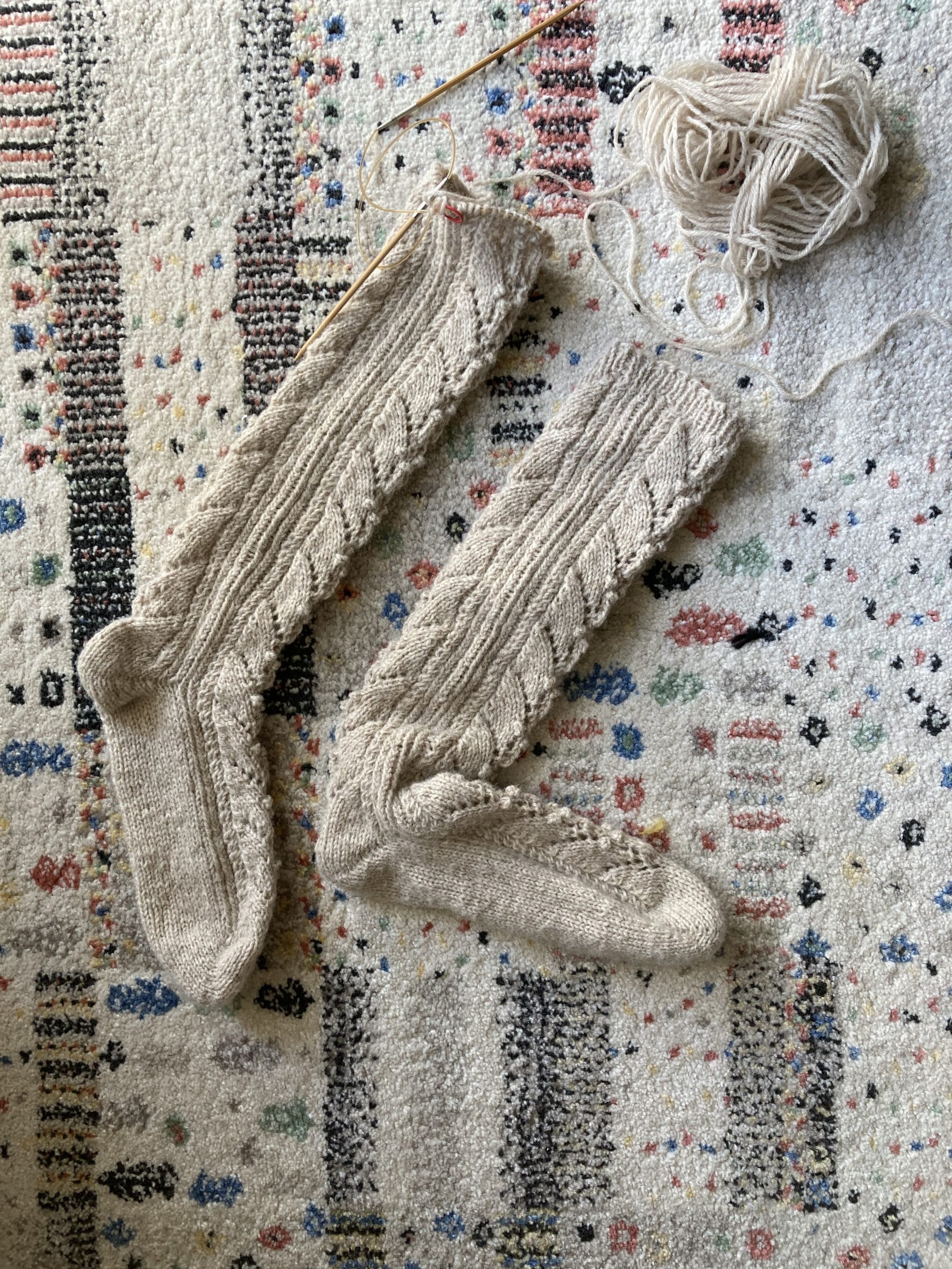 編むのはつま先から、ドイツ式引き返し編みで編みます。文章での説明リストと模様のチャートがついていますので、リストに沿って編んでいただくとスムーズに編めると思います。ドイツ式引き返し編み(German Short Rows )の練習に是非。